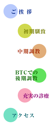 【日進牧場トレーニング場】は、イギリス・アイルランド人を主体とした騎乗者により、高レベルの技術水準を維持、管理体制も厩舎長・副場長・獣医師場長を配置、万全を期しております。「誠心誠意」をもって走る馬を造るべく全員一丸をモットーとしております。